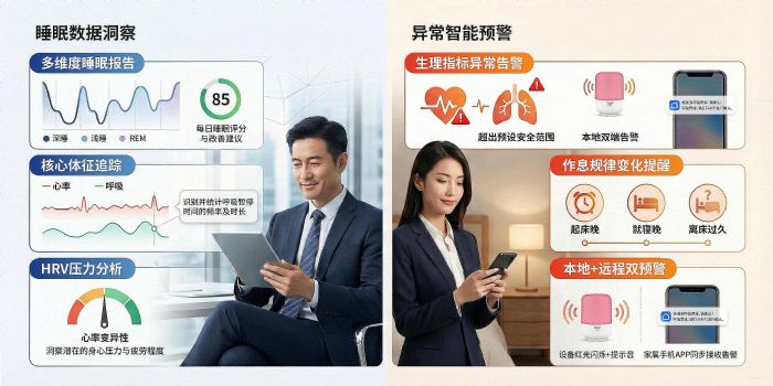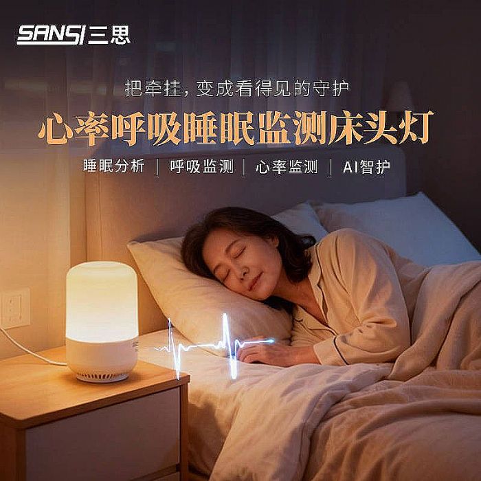 對于追求睡眠舒適度與安全性的中老年群體,傳統(tǒng)穿戴式設(shè)備往往帶來束縛感與心理負擔(dān)。三思床頭燈采用非接觸式毫米波雷達傳感器,以“零束縛、零操作、零負擔(dān)”的方式,默默守護長輩的夜間安睡。設(shè)備可持續(xù)監(jiān)測心率、呼吸頻率,并能智能識別整夜呼吸暫停等異常事件。