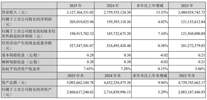 2026 年 3 月,聚燦光電科技股份有限公司(股票簡稱:聚燦光電,股票代碼:300708)發(fā)布 2025 年年度報(bào)告。報(bào)告顯示,公司全年實(shí)現(xiàn)營業(yè)收入 31.27 億元,同比增長 13.33%;歸屬于上市公司股東的凈利潤 2.05 億元,同比增長 4.82%;歸屬于上市公司股東的扣除非經(jīng)常性損益的凈利潤 1.99 億元,同比增長 7.10%,三大核心財(cái)務(wù)指標(biāo)均創(chuàng)同期歷史新高,經(jīng)營業(yè)績穩(wěn)健增長。