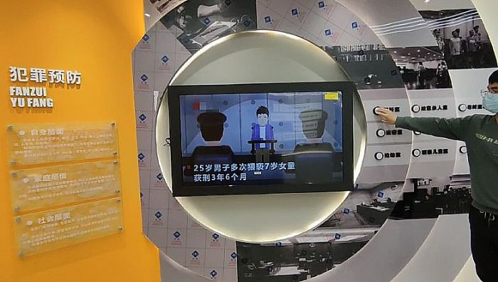 在“以案說(shuō)法”區(qū)域,墻面上整齊排列著9個(gè)實(shí)物按鈕,每個(gè)按鈕對(duì)應(yīng)一個(gè)案例。參觀者點(diǎn)擊按鈕后,65寸交互設(shè)備即刻播放該案例的動(dòng)畫視頻,以生動(dòng)直觀的方式呈現(xiàn)法律后果,起到警示和教育雙重作用。