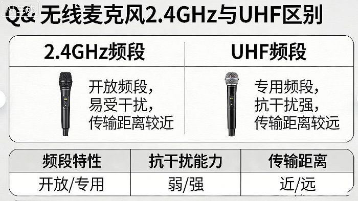 Q2:2.4GHz無線麥克風(fēng)和UHF無線麥克風(fēng)有什么區(qū)別?