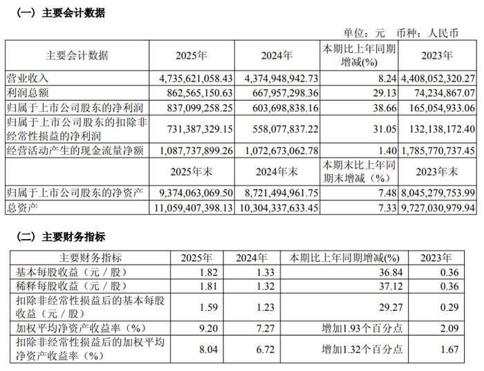 分季度來看,公司經(jīng)營保持穩(wěn)定增長態(tài)勢。2025 年第一至四季度,營業(yè)收入分別為 10.64 億元、11.87 億元、12.69 億元和 12.15 億元;歸屬于上市公司股東的凈利潤分別為 1.95 億元、2.35 億元、2.46 億元和 1.60 億元,各季度均實(shí)現(xiàn)盈利。