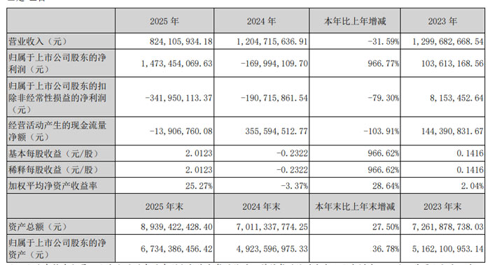 2026 年 3 月,北京賽微電子股份有限公司(證券代碼:300456,證券簡(jiǎn)稱:賽微電子)發(fā)布 2025 年年度報(bào)告。報(bào)告顯示,公司全年實(shí)現(xiàn)營(yíng)業(yè)收入 8.24 億元,同比下降 31.59%;歸屬于上市公司股東的凈利潤(rùn) 14.73 億元,同比大幅增長(zhǎng) 966.77%;扣除非經(jīng)常性損益的歸屬于上市公司股東的凈利潤(rùn) - 3.42 億元,同比下降 79.30%;基本每股收益 2.01 元。