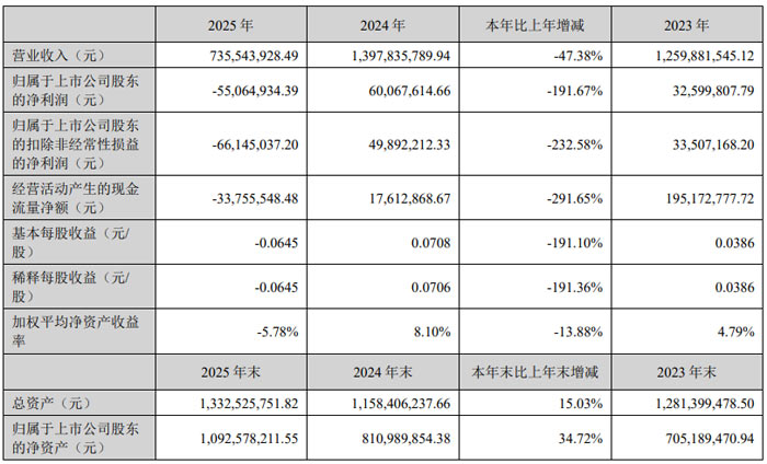 2026 年 3 月,深圳市索菱實業(yè)股份有限公司(股票簡稱:索菱股份,股票代碼:002766)發(fā)布 2025 年年度報告。報告顯示,公司全年實現(xiàn)營業(yè)收入 7.36 億元,同比下降 47.38%;歸屬于上市公司股東的凈利潤為 - 0.55 億元,同比下降 191.67%;歸屬于上市公司股東的扣除非經(jīng)常性損益的凈利潤為 - 0.66 億元,同比下降 232.58%;基本每股收益 - 0.06 元。截至 2025 年末,公司總資產(chǎn) 13.33 億元,同比增長 15.03%;歸屬于上市公司股東的凈資產(chǎn) 10.93 億元,同比增長 34.72%。