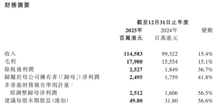 2025 年,TCL 電子實(shí)現(xiàn)營收 1145.83 億港元,較 2024 年的 993.22 億港元同比增長 15.4%;毛利達(dá) 179.00 億港元,同比增長 15.1%;除稅后利潤 25.27 億港元,同比增長 36.7%;歸屬于母公司擁有者凈利潤 24.95 億港元,同比大幅增長 41.8%;經(jīng)調(diào)整歸母凈利潤 25.12 億港元,同比飆升 56.5%。為回饋股東,公司建議派發(fā)末期股息每股 49.80 港仙,較 2024 年的 31.80 港仙增長 56.6%,派息率達(dá)經(jīng)調(diào)整歸母凈利潤的約 50%,持續(xù)踐行高派息政策。