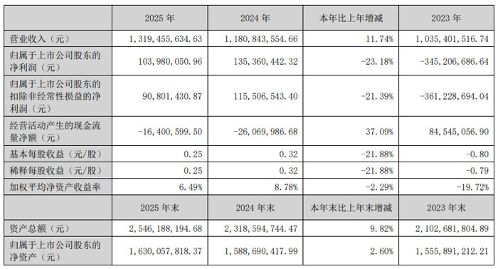 2026 年 3 月,北京高盟新材料股份有限公司(股票簡(jiǎn)稱:高盟新材,股票代碼:300200)發(fā)布 2025 年年度報(bào)告。報(bào)告顯示,公司全年實(shí)現(xiàn)營(yíng)業(yè)收入 13.19 億元,同比增長(zhǎng) 11.74%;歸屬于上市公司股東的凈利潤(rùn) 1.04 億元,同比下降 23.18%;歸屬于上市公司股東的扣除非經(jīng)常性損益的凈利潤(rùn) 0.91 億元,同比下降 21.39%;基本每股收益 0.25 元。