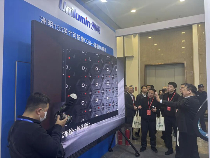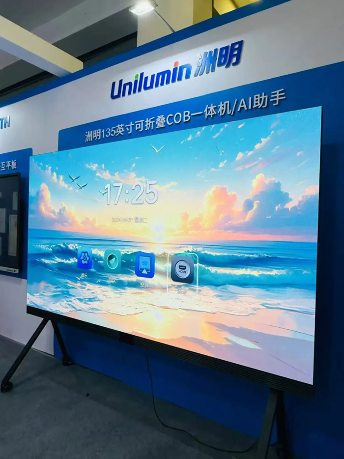震撼的視覺沖擊、無縫拼接的巨幕效果,讓校園信息發(fā)布、大型活動、學(xué)術(shù)報告廳煥發(fā)全新活力。本次展會,我們隆重帶來了 洲明135英寸可折疊超薄一體機——全球首發(fā) 的明星產(chǎn)品!它集可折疊、超薄輕便、高清顯示于一身,徹底解決了傳統(tǒng)LED運輸難、安裝繁的痛點,為教育場景提供了前所未有的靈活大屏解決方案。領(lǐng)導(dǎo)們親臨體驗后,對產(chǎn)品的穩(wěn)定性、色彩還原度及低藍(lán)光護眼特性給予了充分肯定,尤其對“全球首發(fā)”的創(chuàng)新意義贊不絕口。