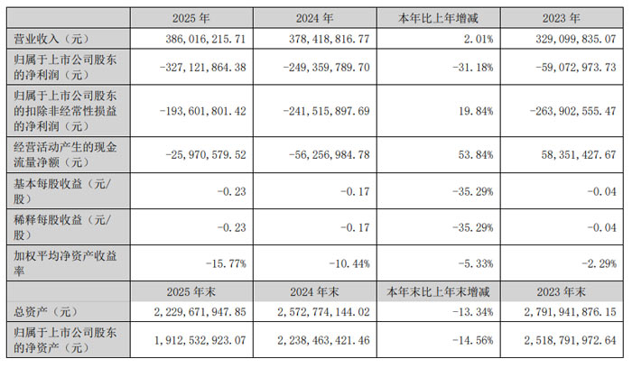 2025 年,勤上股份實現(xiàn)營業(yè)收入3.86 億元,同比增長2.01%;歸屬于上市公司股東的凈利潤-3.27 億元,同比下降31.18%;扣除非經(jīng)常性損益后的凈利潤-1.94 億元,同比減虧19.84%。經(jīng)營活動產(chǎn)生的現(xiàn)金流量凈額-2597.06 萬元,較上年同期改善53.84%。