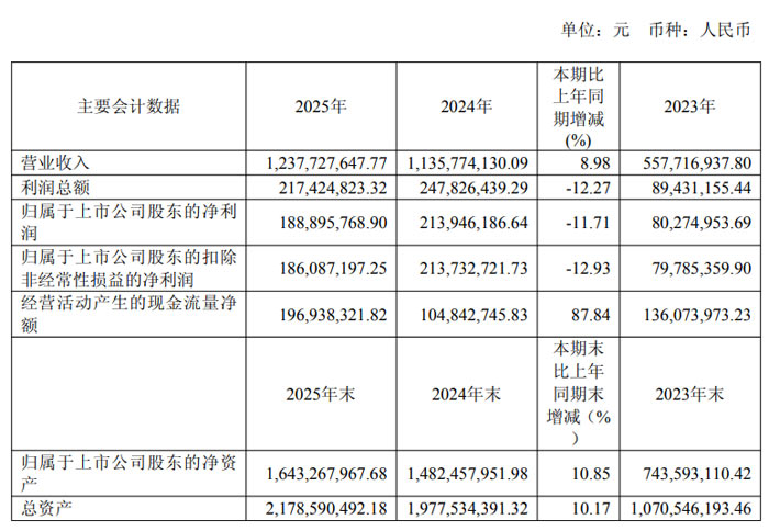 2025 年,公司實(shí)現(xiàn)營(yíng)業(yè)收入 12.38 億元,同比增長(zhǎng) 8.98%;歸屬于上市公司股東的凈利潤(rùn) 1.89 億元,同比下降 11.71%;扣除非經(jīng)常性損益后的凈利潤(rùn) 1.86 億元,同比下降 12.93%。