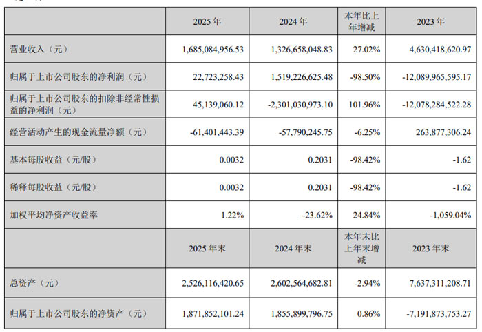 2025 年,合力泰實現(xiàn)營業(yè)收入 16.85 億元,較上年同期增長 27.02%;歸屬于上市公司股東的凈利潤2272.33 萬元,同比下降 98.50%;歸屬于上市公司股東的扣除非經(jīng)常性損益的凈利潤4513.91 萬元,同比增長 101.96%,實現(xiàn)經(jīng)營性盈利。