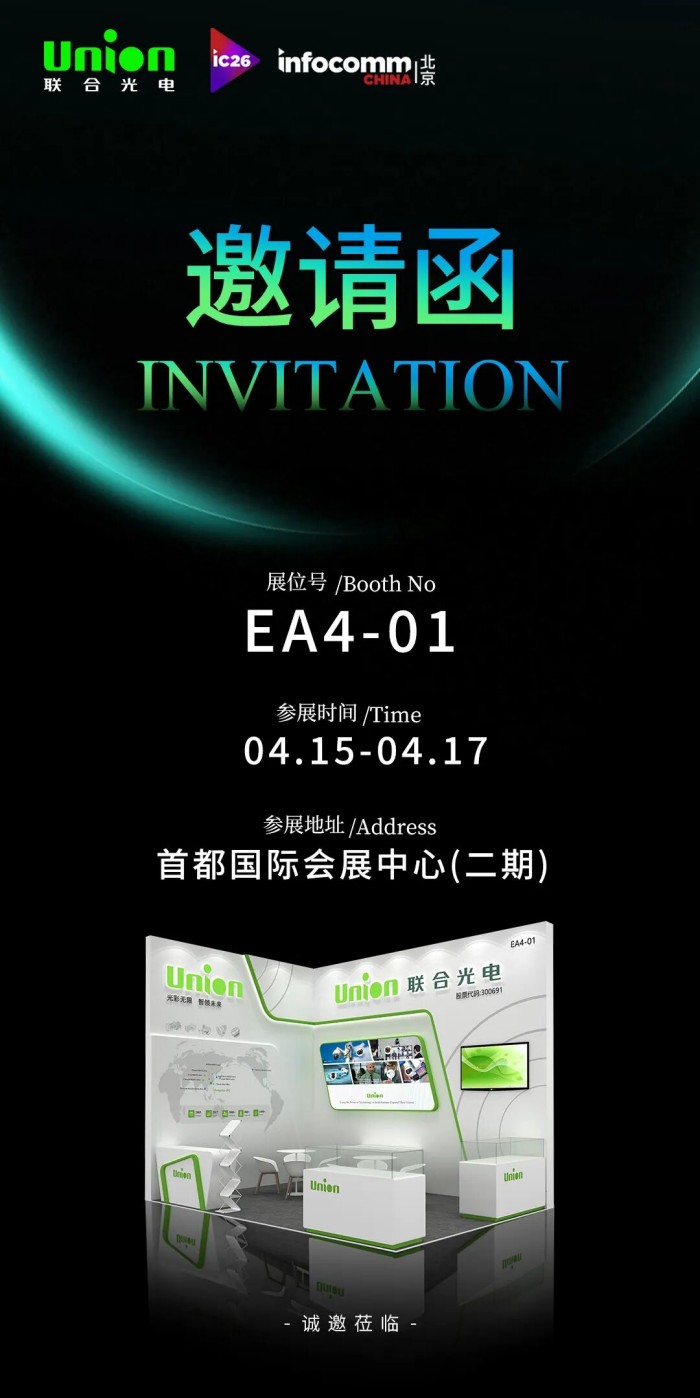 技術(shù)不止于參數(shù),更在于真實場景中的穩(wěn)定表現(xiàn)與持續(xù)價值。聯(lián)合光電始終堅持以光學(xué)為核心,以創(chuàng)新為驅(qū)動,為全球客戶提供從設(shè)計、研發(fā)到量產(chǎn)的一站式光學(xué)解決方案。2026北京InfoComm,我們將在EA4-01期待您的到來,期待與您共繪清晰、智能、沉浸的光學(xué)未來!