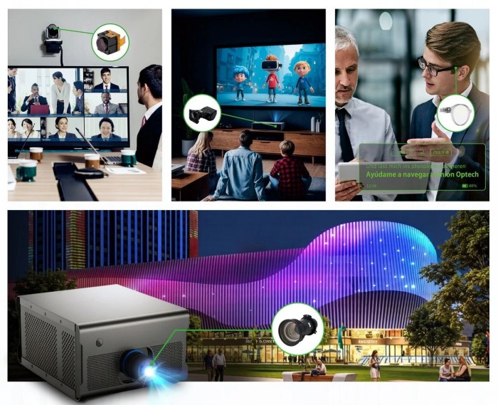 投影顯示領(lǐng)域,聯(lián)合光電自主研發(fā)的投影鏡頭,支持4K/8K超高清解析度,兼顧小型化與高效率設(shè)計,為激光投影、工程投影及家用投影設(shè)備提供核心光學(xué)支撐。此外,聯(lián)合光電持續(xù)投入Pancake折疊光路、自由曲面、光波導(dǎo)等前沿技術(shù)的開發(fā),研發(fā)并落地Micro LED Light Engine技術(shù)推動AR眼鏡向更輕更薄、更接近普通眼鏡外形的方向發(fā)展,為元宇宙概念落地提供堅實可靠的硬件基礎(chǔ)。
