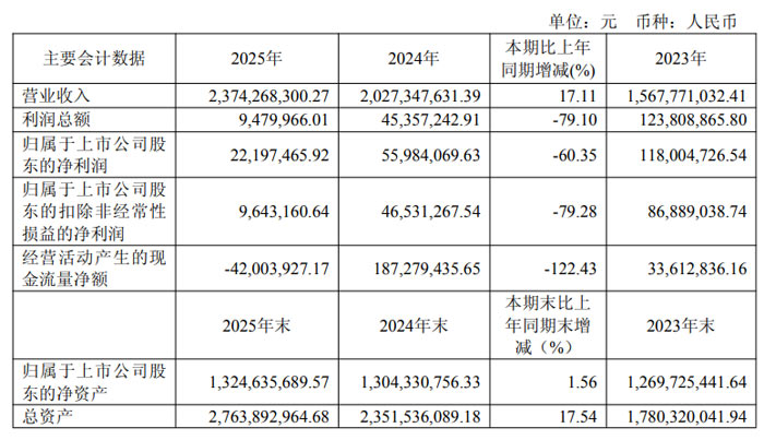 財務(wù)數(shù)據(jù)顯示,2025 年公司歸屬于上市公司股東的凈利潤為 0.22 億元,同比下降 60.35%;扣除非經(jīng)常性損益后的凈利潤為 0.09 億元,同比下降 79.28%。利潤階段性承壓主要系研發(fā)投入持續(xù)加大、子公司新建生產(chǎn)線產(chǎn)能利用率爬坡導致固定成本攤薄,以及匯率變動方向逆轉(zhuǎn)等因素影響。