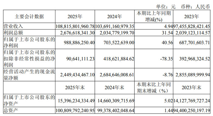2025 年,四川長(zhǎng)虹實(shí)現(xiàn)營(yíng)業(yè)收入 1088.16 億元,同比增長(zhǎng) 4.94%;實(shí)現(xiàn)利潤(rùn)總額 26.77 億元,同比增長(zhǎng) 31.54%;歸屬于上市公司股東的凈利潤(rùn) 9.89 億元,同比增長(zhǎng) 40.56%。經(jīng)營(yíng)活動(dòng)產(chǎn)生的現(xiàn)金流量?jī)纛~ 24.49 億元,整體現(xiàn)金流保持健康。