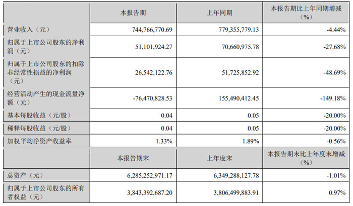 經(jīng)營(yíng)活動(dòng)產(chǎn)生的現(xiàn)金流量?jī)纛~為 **-0.76 億元 **,較上年同期的1.55 億元同比下降149.18%;基本每股收益與稀釋每股收益均為0.04 元 / 股,較上年同期的0.05 元 / 股下降20.00%;加權(quán)平均凈資產(chǎn)收益率為1.33%,較上年同期減少0.56 個(gè)百分點(diǎn)。