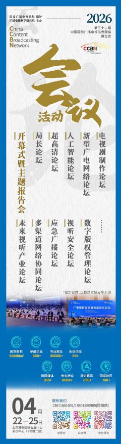 由國家廣播電視總局指導(dǎo)、廣播電視科學(xué)研究院主辦的第32屆中國國際廣播電視信息網(wǎng)絡(luò)展覽會(CCBN2026)將于2026年4月22-25日在北京首鋼國際會展中心舉行!詳情>>
